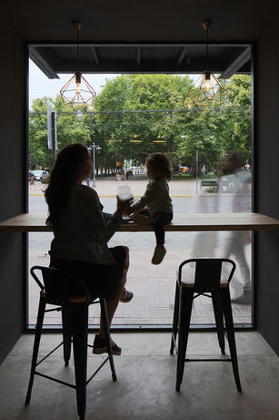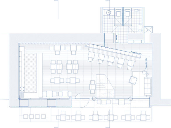 El proyecto de este bar/restaurant se configura en dos niveles; el primero corresponde al acceso y al área de preparaciones en que una barra media entre la zona pública con la de trabajo. Parte de la cocina se exhibe hacia el acceso y hacia la calle por medio de un gran vano que en su espesor acoge una segunda barra que mira hacia la calle y la plaza. El segundo piso corresponde al salón, el cual se resuelve en un solo recinto, pero con distintas instancias determinadas por la ubicación de la escalera y por elementos particulares que otorgan distintos formatos. Por otra parte, un balcón pre-existente que recorre el largo completo de la fachada se readecúa y se transforma en el elemento particular del local configurándose como un corredor urbano elevado que bajo su techumbre inclinada, que hace coincidir su cumbrera con la altura de la edificación contigua, se dispone para gozar de las vistas hacia la catedral, la plaza y la ciudad misma. Finalmente, el diseño de este restaurant evita la decoración y la incorporación de elementos ornamentales con el fin de poner en valor los elementos propios del lugar exhibiendo las texturas de los materiales pre-existentes como las vigas de su antigua techumbre, el entablado de sus pisos y las albañilerías.
